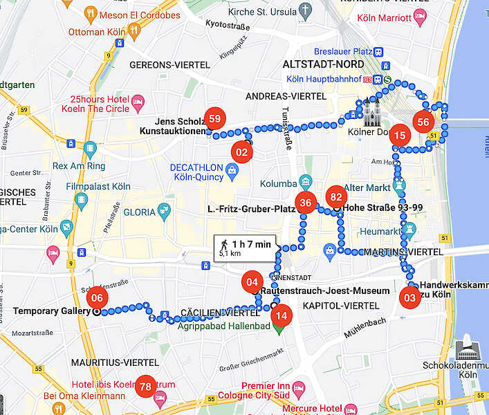 Wie wäre es z.B. mit einem Zick-Zack-Kurs durch die Innenstadt? Wir haben eine Route für euch vorbereitet, auf der ihr alle Ausstellungsorte des Zentrums Kölns findet, ihr pickt euch einfach eure Rosinen raus oder macht mehrere Etappen an unterschiedlichen Tagen draus. Denn Achtung: Hier liegen auch alle großen Museen, für die ihr z.T. etwas mehr Zeit einplanen solltet.