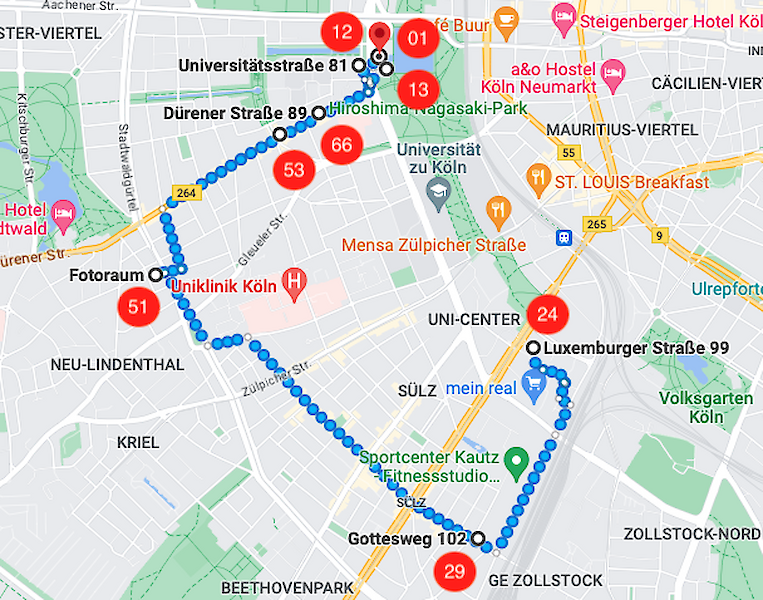 Wie wäre es z.B. mit einem Rundgang durch Sülz und Lindenthal? Wir haben eine Route für euch vorbereitet, auf der ihr alle Ausstellungsorte der Viertel findet, ihr pickt euch einfach eure Rosinen raus oder macht mehrere Etappen an unterschiedlichen Tagen draus.