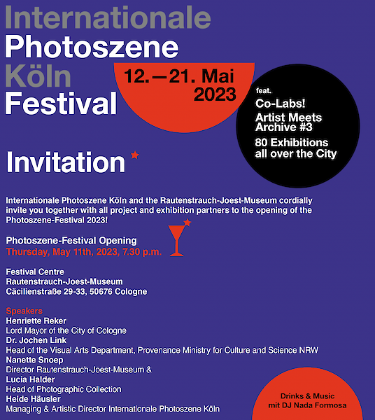 Herzliche Einladung zur Eröffnungsfeier des diesjährigen Photoszene-Festivals 2023 ins Rautenstrauch-Joest-Museum am 11. Mai 2023 um 19.30 Uhr! Gemeinsam mit allen teilnehmenden Partnerausstellungen feiern wir an diesem Abend den Start des 10-tägigen Festivals in Köln.