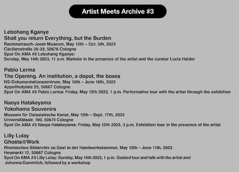 Wir warten auf Euch mit einer Ausstellung von Lebohang Kganye, die im Rahmen des Artist Meets Archive Programms eine spektakuläre Mehrkanalprojektion und Installation über ihre Reise nach Kamerun realisiert hat und der Ausstellung First Pages, die das RJM in Kooperation mit den Hochschulen Dortmund und Hannover und vierzig Studierenden gemacht hat. Und hat jemand von Euch schon mal auf den Inkunabeln westlicher Kunstgeschichtsschreibung getanzt? Dann herzliches Hereinspaziert! Die begeh- und vor allem betanzbare Dance Floor Installation von unserem ehemaligen Artist Meets Archive Künstlers Philipp Goldbach (AMA #2) wartet im Erdgeschoss auf Euch; Drinks und Music von DJ Formosa. Wir freuen uns auf Euch!